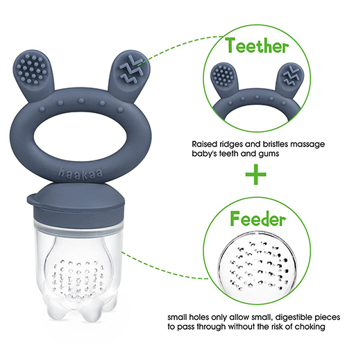 A Must-have for Teething Babies: The baby feeder can also help massage baby gums through chewing and soothe baby teething pain. Just put the baby food, frozen fruit, vegetables,meat or frozen breast milk pieces into the pouch, your baby will enjoy chewing and tasting it Easy-to-hold Handle: Baby fruit food feeder is design with a big rabbit head handle, allows easy grap for little hands. Encourages baby to self-feed, builds independence and improves hand-eye coordination. Suitable for baby 4 months+
