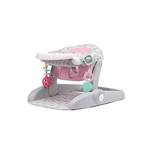 TOYS AND SNACK TRAY: This baby floor activity seat features two removable toys that can be linked to the seat or detached for continued playtime fun, including a textured teether and a ball that rattles. A detachable feeding tray makes it the perfect snacktime companion.